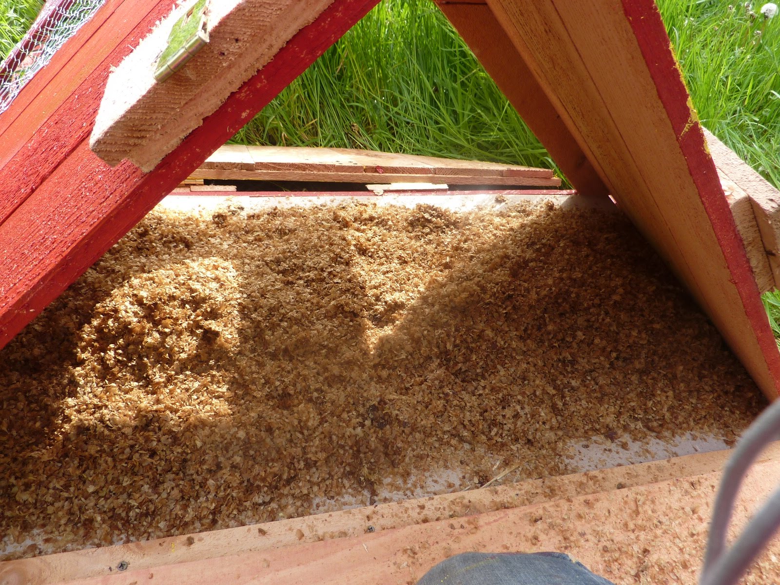 The coop floor is lined with linoleum (leftover from the main coop construction) for easy cleaning. While it will get dirty, it is better than wood soaked with droppings.
